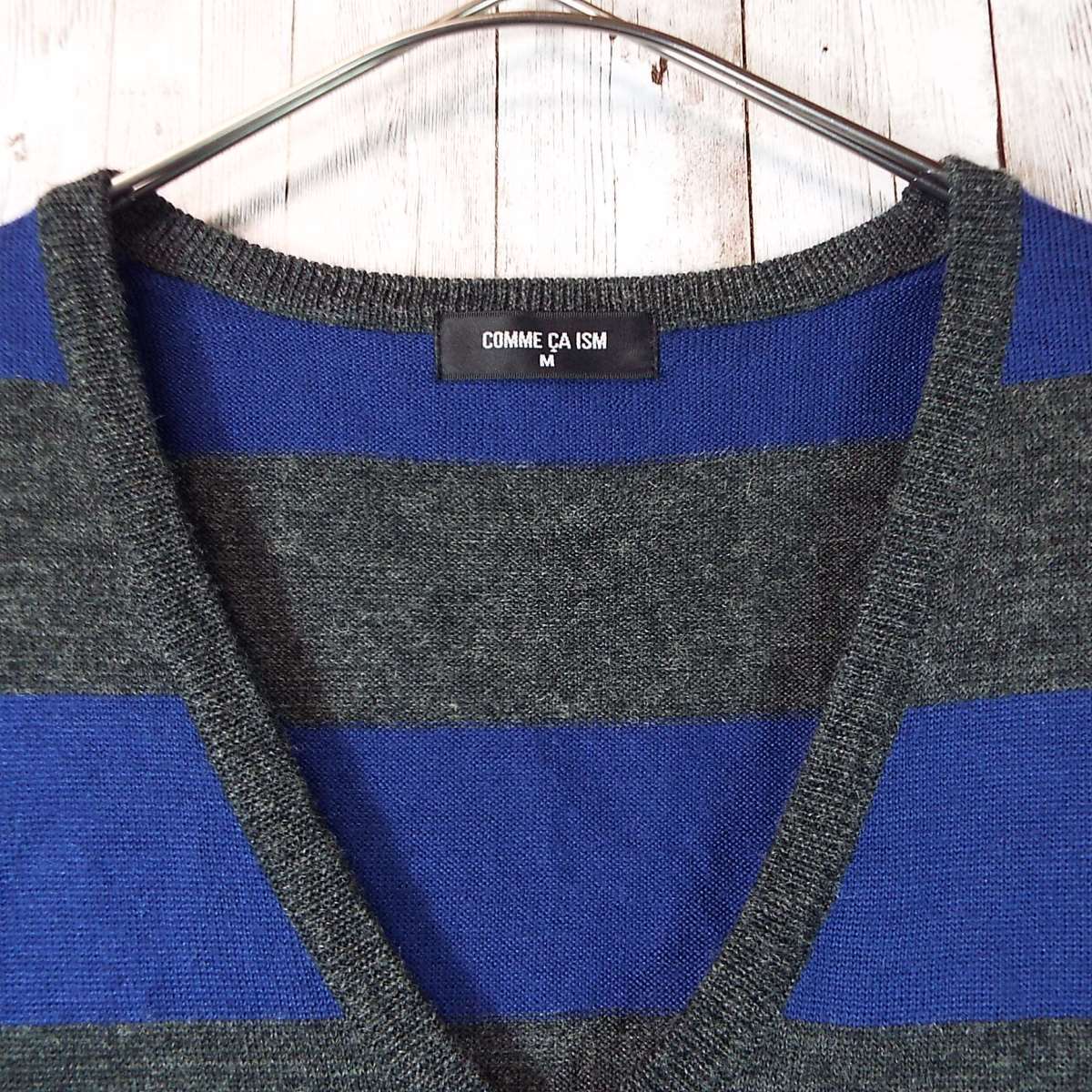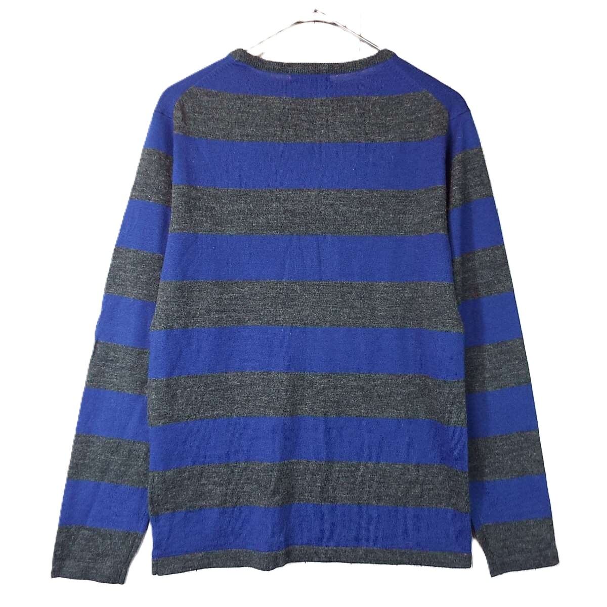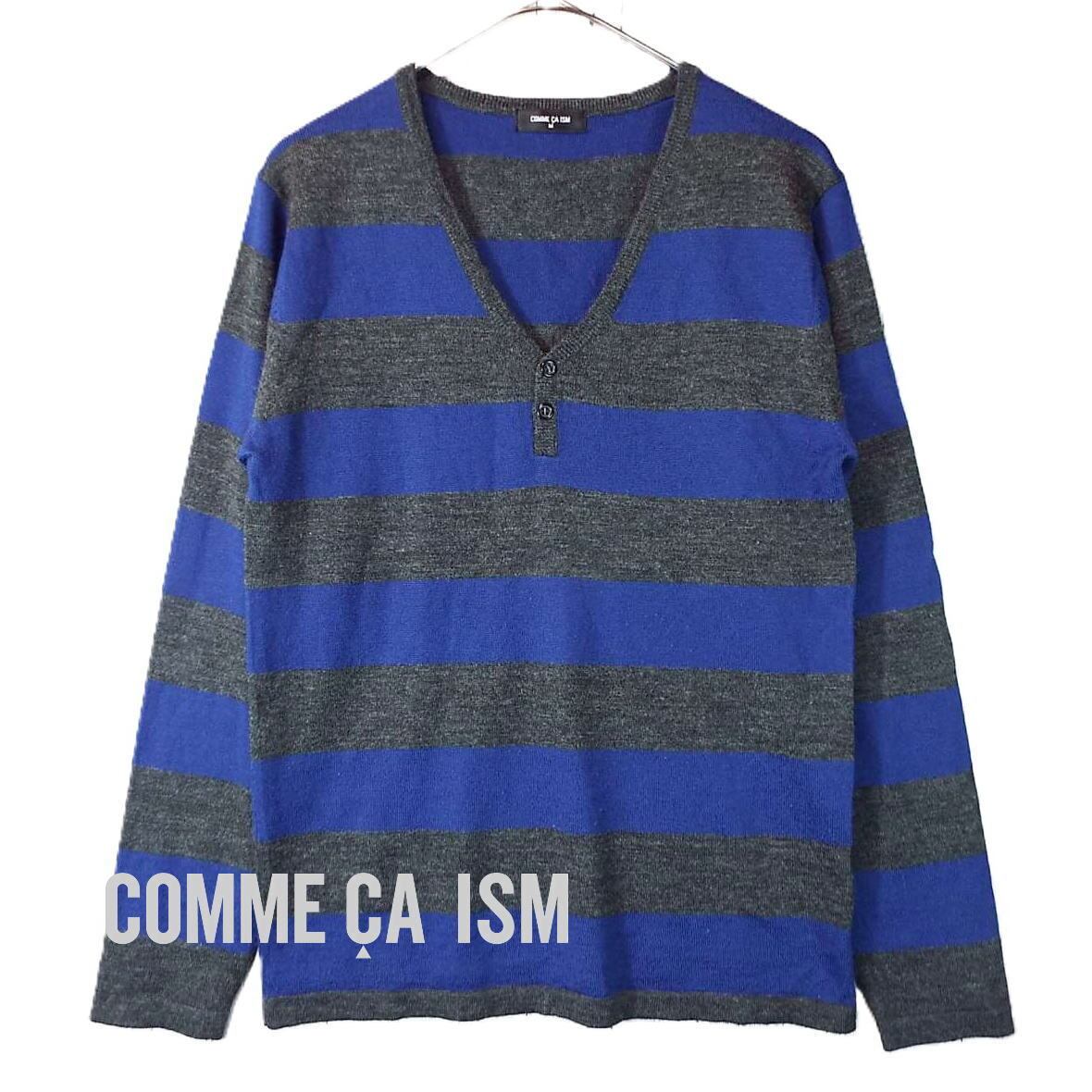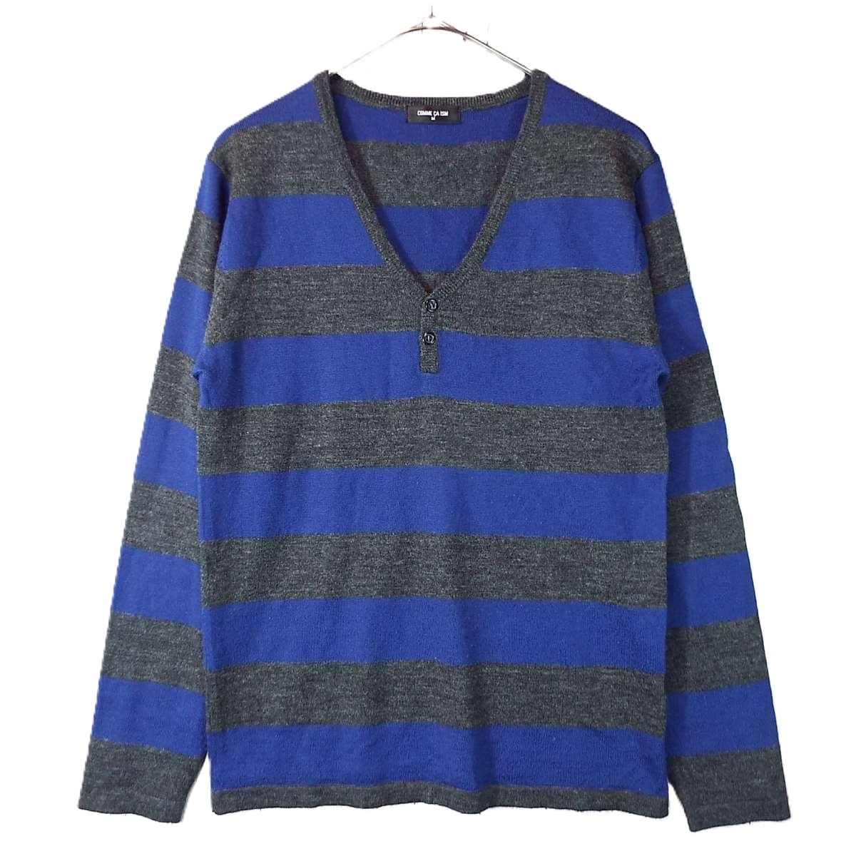 【ボタン留め】COMME CA IZM コムサイズム ボーダー柄 Vネック 長袖ニットセーター Mサイズ(肩幅cm)ブルー・グレー【湘南倉庫】メンズブランド古着