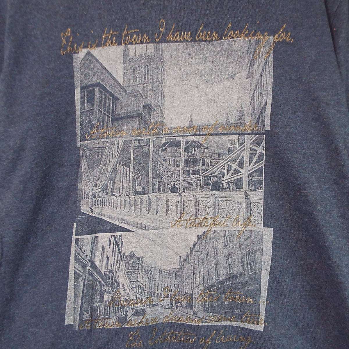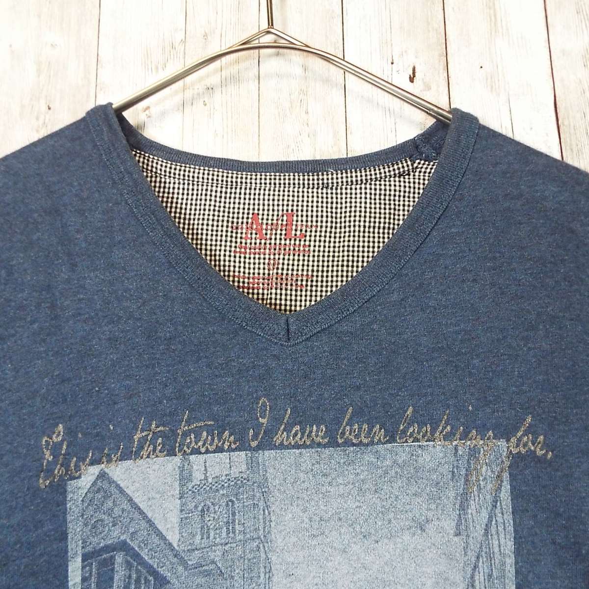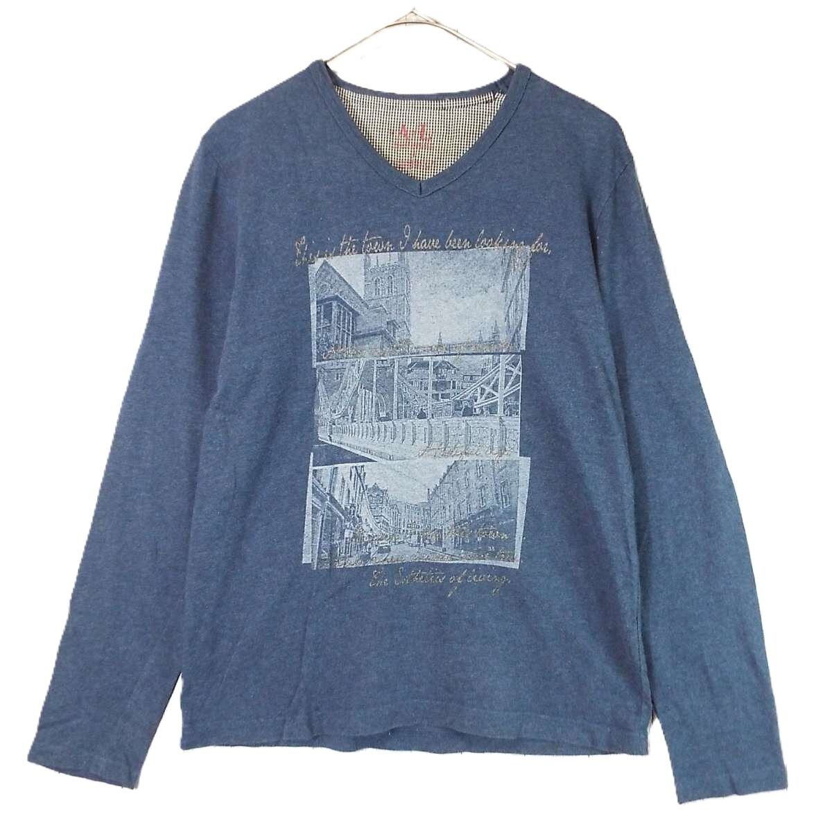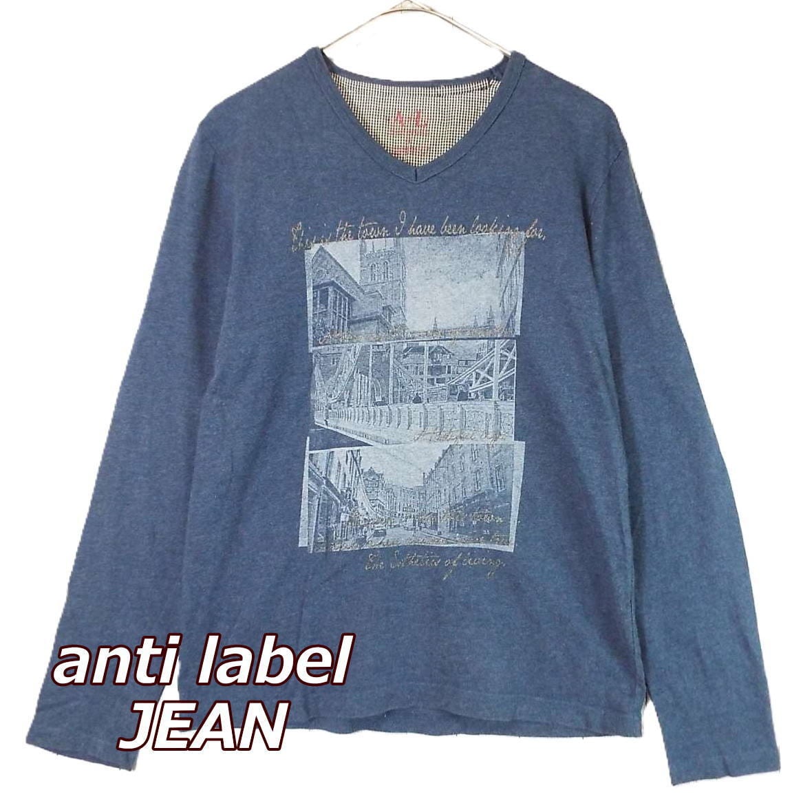 【肩幅41cm】anti label JEAN アンティ・ラベル・ジーン ピクチャー&レタード Vネック 長袖Tシャツ Mサイズ グレーネイビー コットン100% ロンT【湘南倉庫】メンズブランド古着