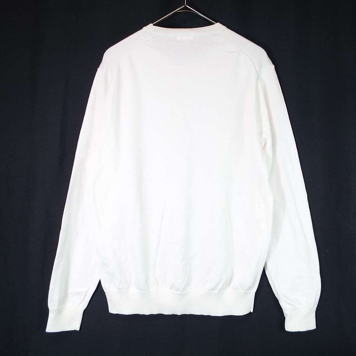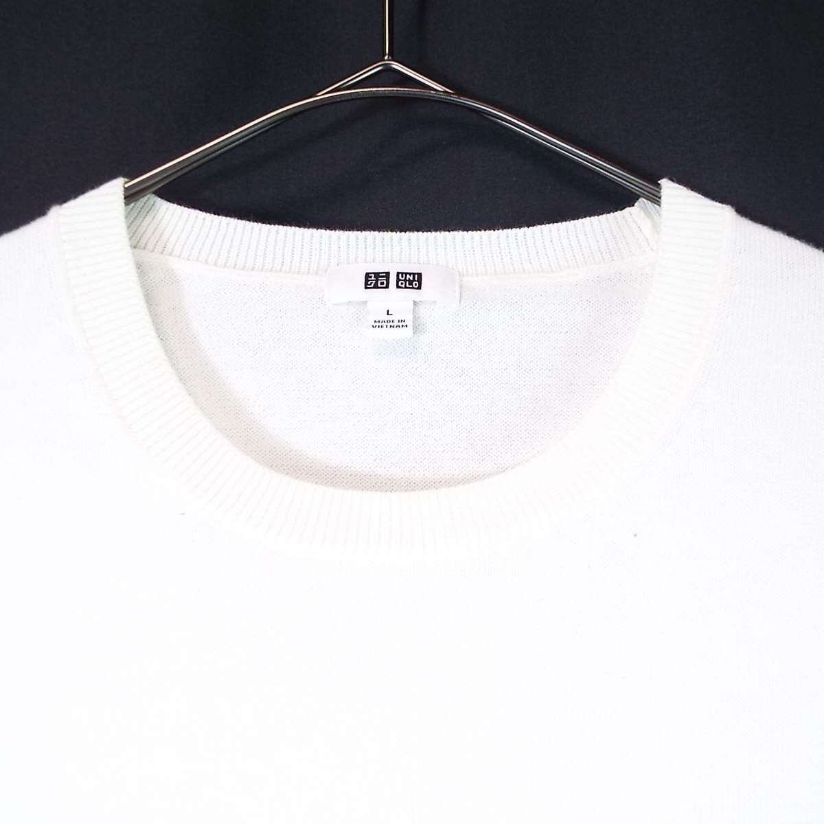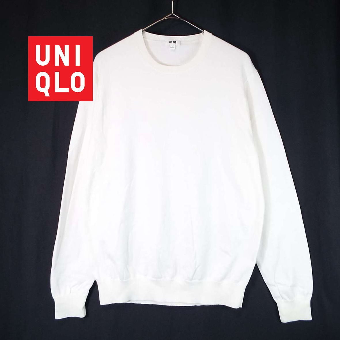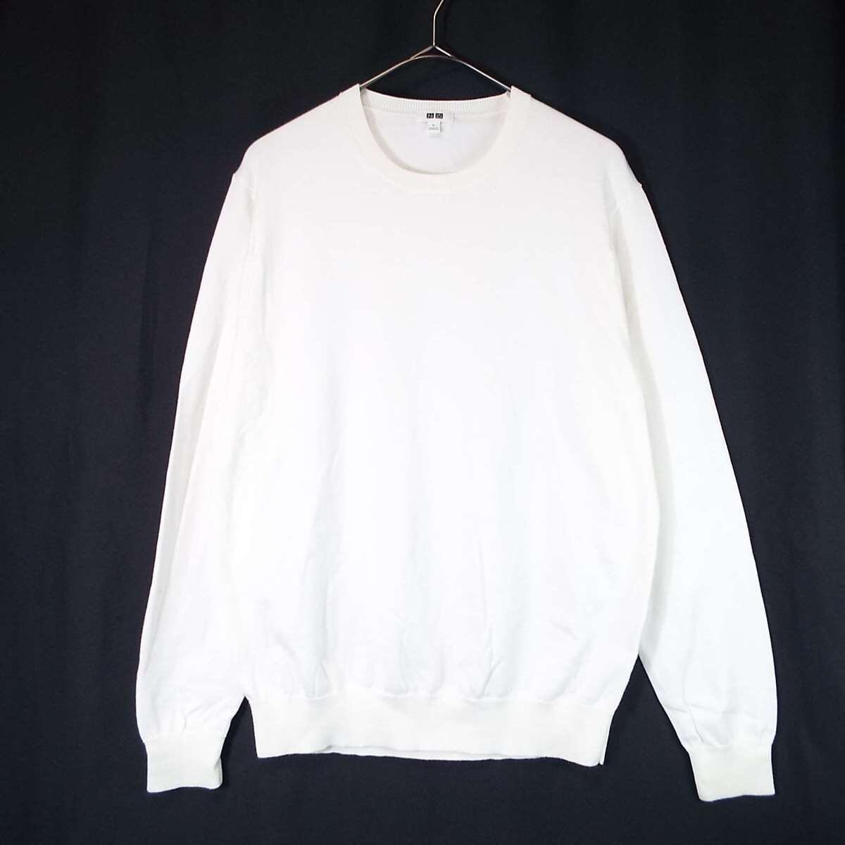 【ピーマコットン100%】UNIQLO ユニクロ クルーネック 無地 ハイゲージ 長袖ニットセーター Lサイズ(肩幅42cm)ホワイト 【湘南倉庫】メンズブランド古着