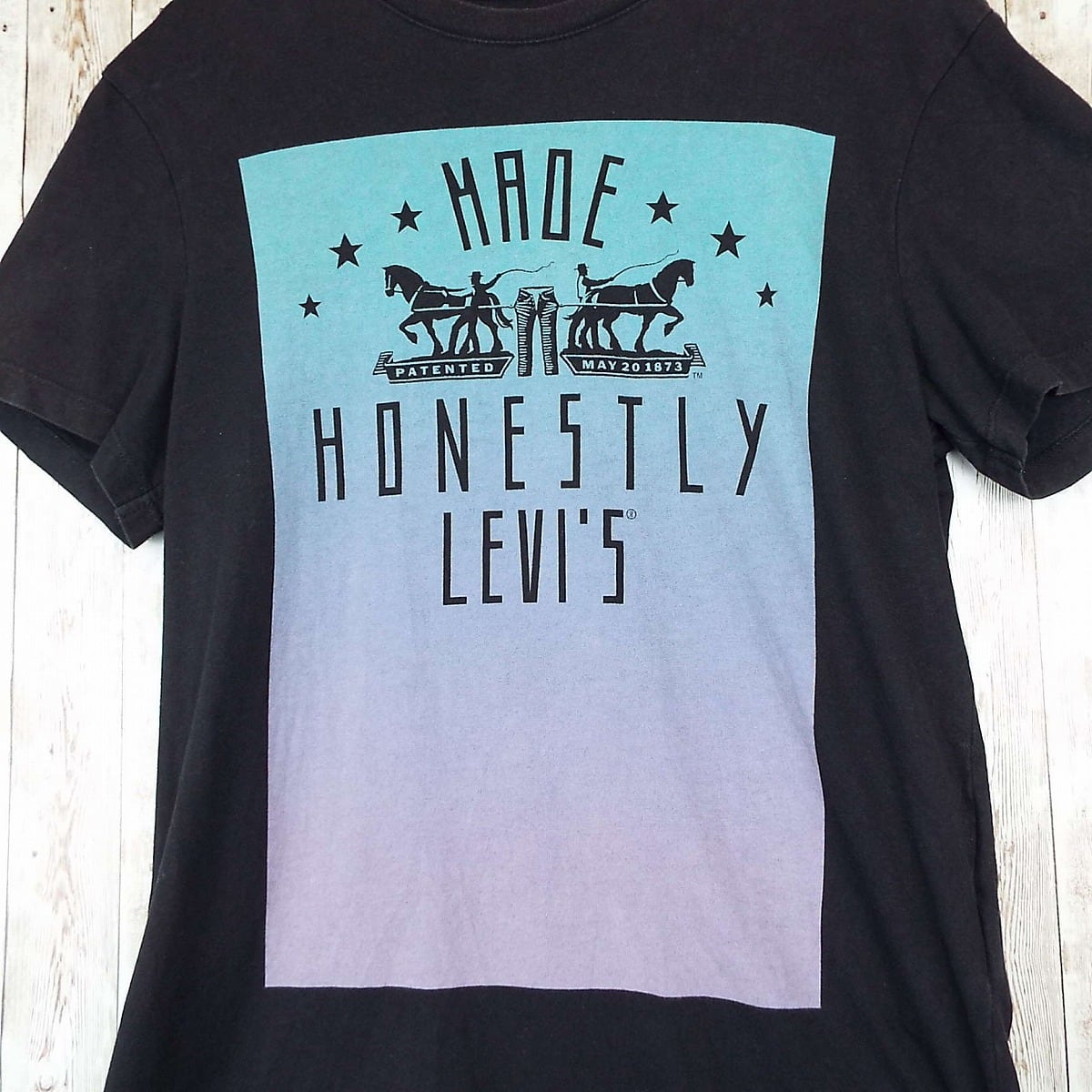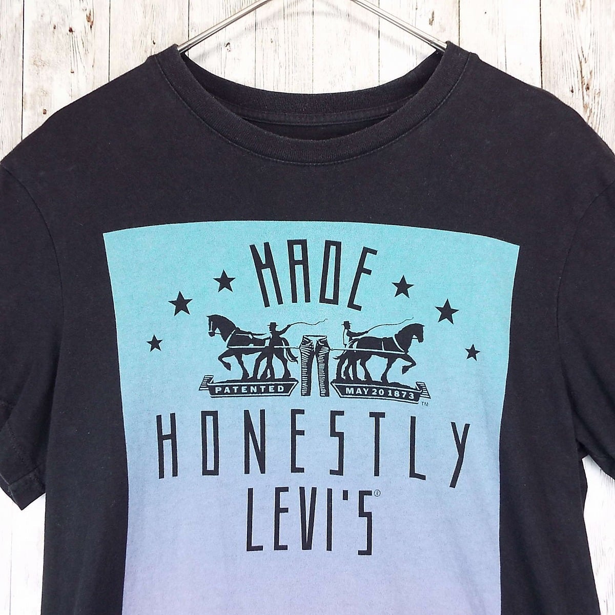Levi's リーバイス MADE HONESTLY ブランドロゴ グラフィック 前プリ 白タグ ブラック フェード感 S-Mサイズ コットン100% USED古着 メンズ ユニセックス【湘南倉庫】