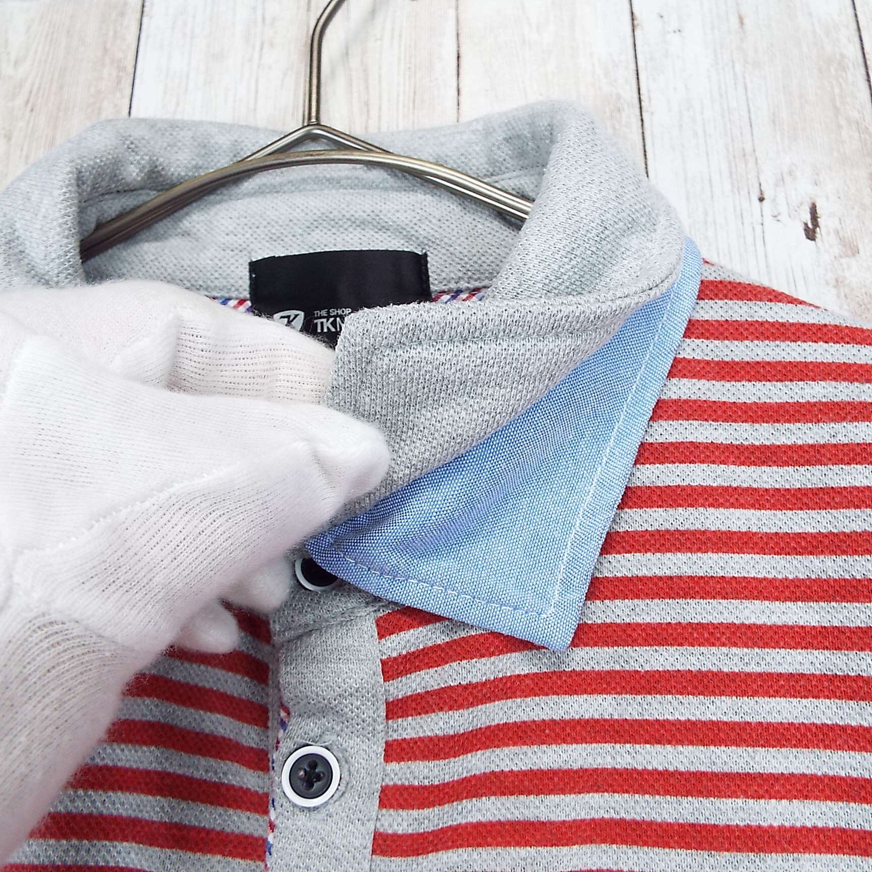 THE SHOP TK MIXPICE タケオキクチ 二重襟 ダブルカラー ストライプ 5B 半袖 ポロシャツ レッド・ライトグレー Mサイズ メンズ古着 ユニセックス【湘南倉庫】
