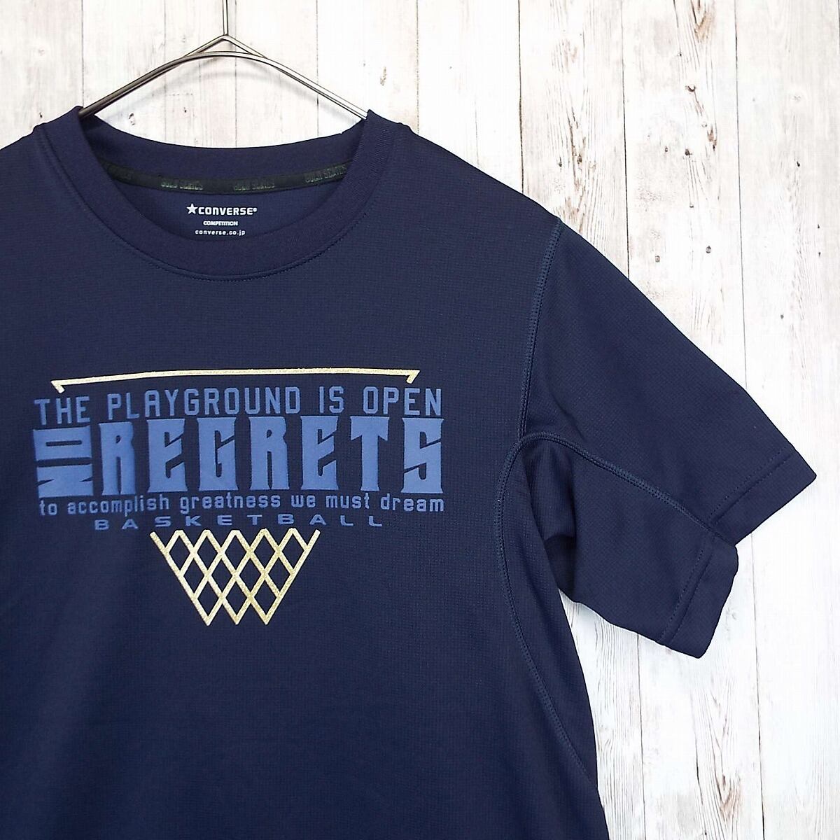 CONVERSE コンバース ポリ素材 速乾 英字ロゴ 半袖Tシャツ ネイビー・ゴールド SSサイズ メンズ古着 ユニセックス 春夏物【湘南倉庫】