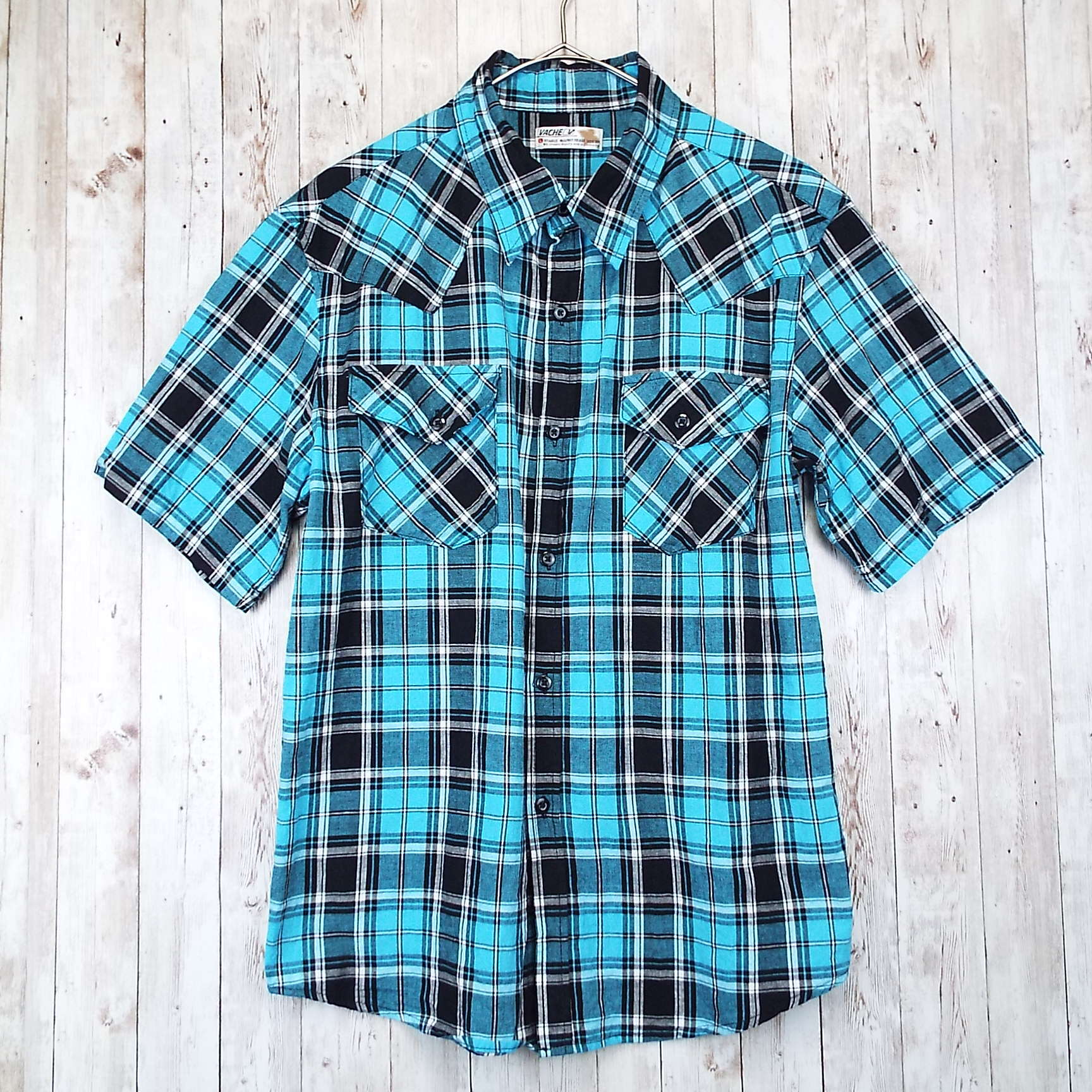 VACHE ヴァッシュ ダブルポケット チェック柄 ウエスタンシャツ 半袖シャツ Lサイズ コットン100% ブルー・ホワイト・ブラック メンズ古着 ユニセックス 春夏物【湘南倉庫】