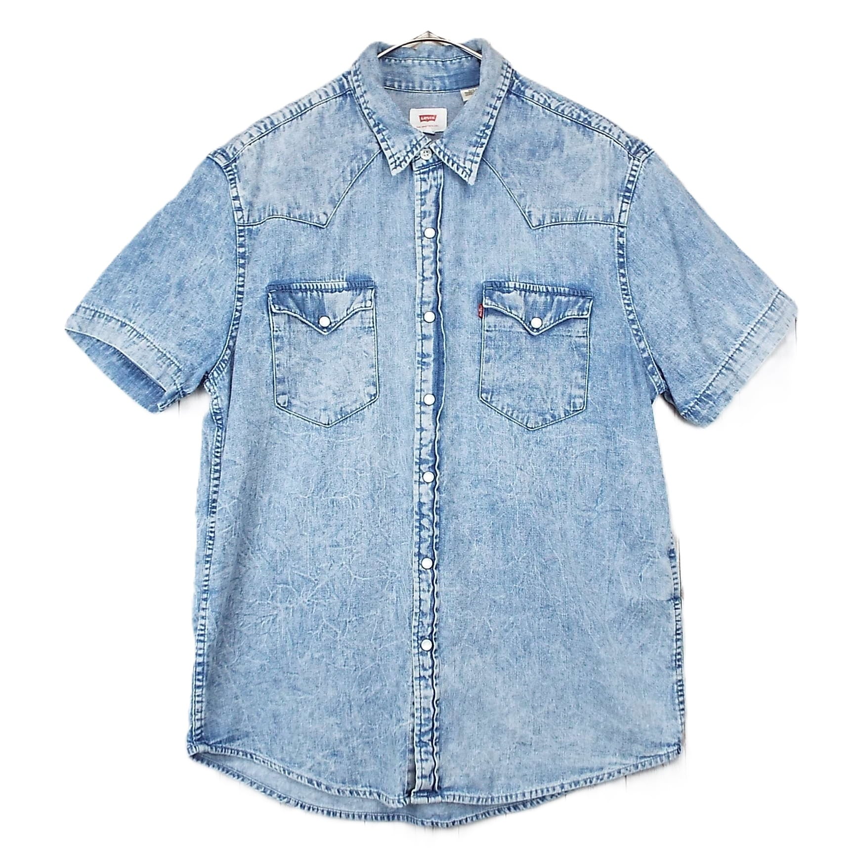 【肩幅47.5cm】Levi's リーバイス エイジングデニム フェード感 パールスナップボタン 赤タグ スモール ウエスタンシャツ 半袖シャツ Mサイズ コットン100% ブルー メンズ古着 ユニセックス 春夏物【湘南倉庫】