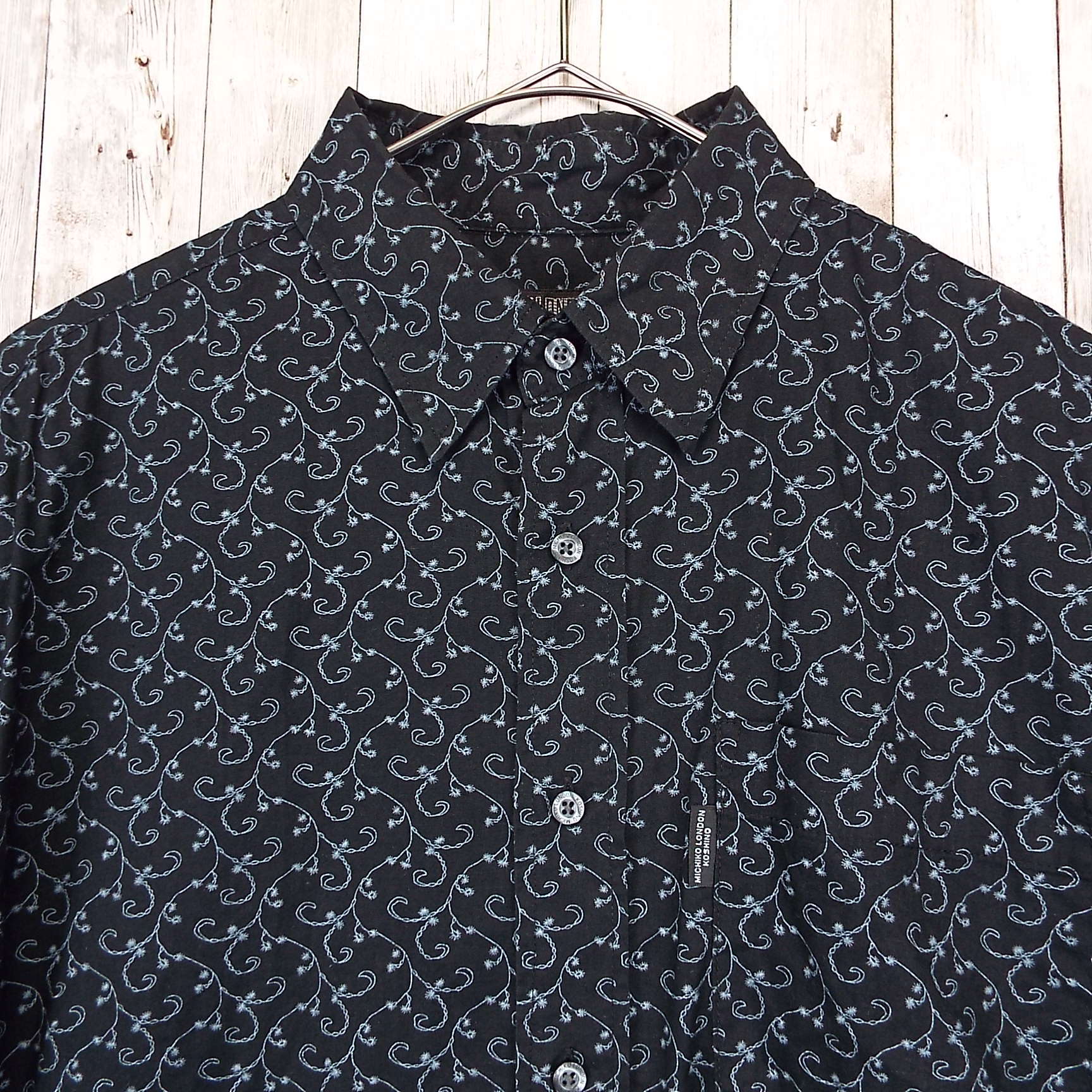 ヴィンテージ|MICHIKO LONDON チェーン 総柄 フルオープン 半袖シャツ ブラック Lサイズ メンズ古着【湘南倉庫】春夏 S/S