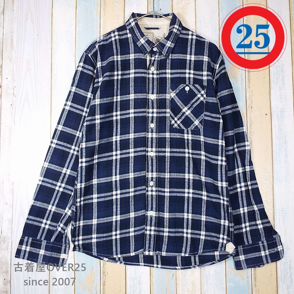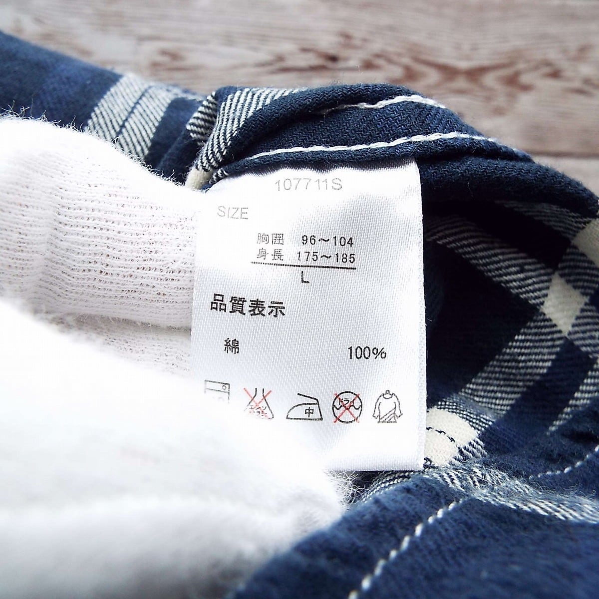 【猫目ボタンのネイビー・ネルシャツ】IKKA イッカ チェック柄 長袖シャツ オフホワイト白紺 Lサイズ【湘南倉庫】メンズ・ユニセックス古着 12350162