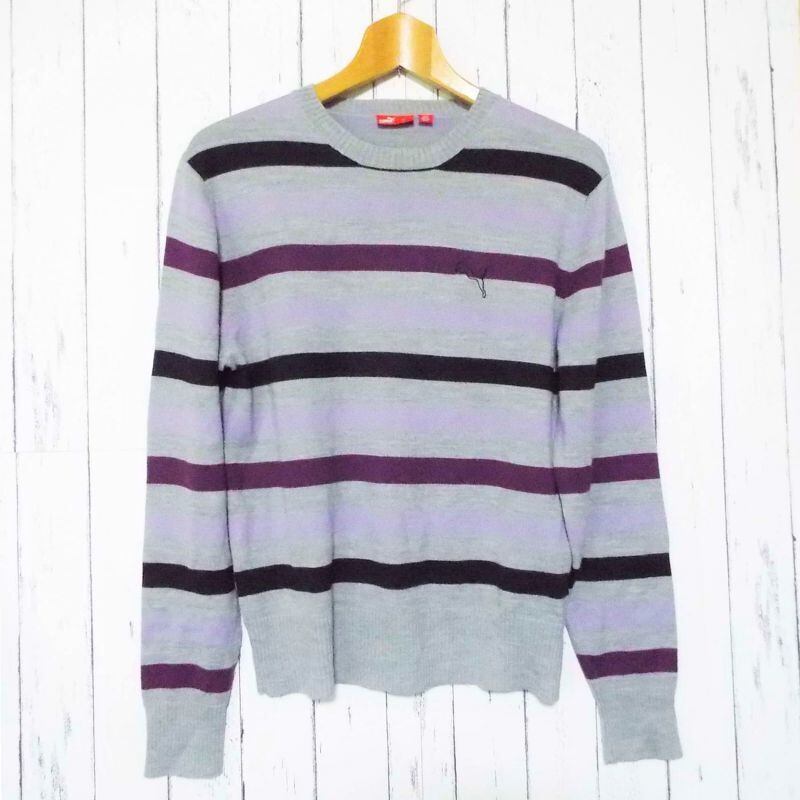 【SOLD OUT】オーナーお薦めの1着! Puma(プーマ) ボーダー柄 ウール混 丸首 長袖 ニット(セーター)グレー・パープル系|サイズ:M|メンズ|ユニセックス|USED,"682222776826"