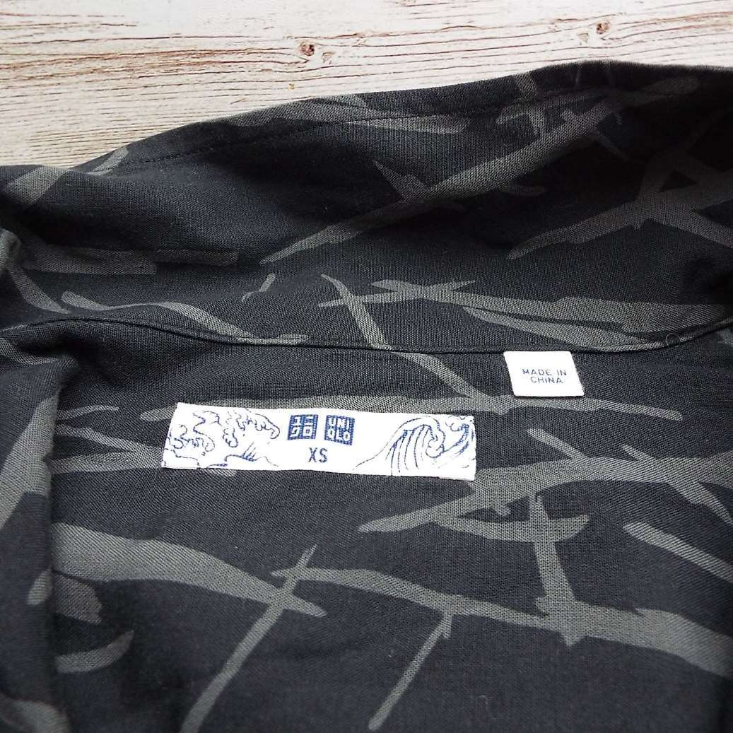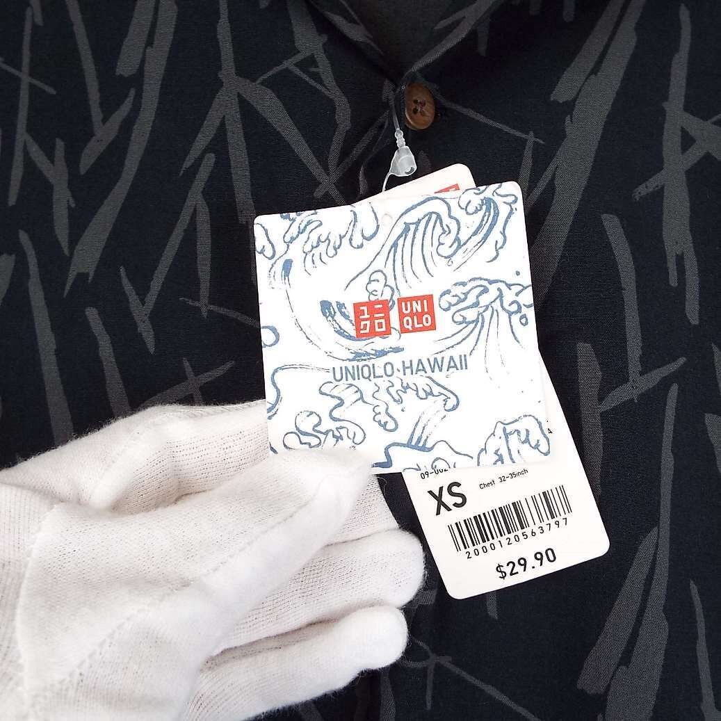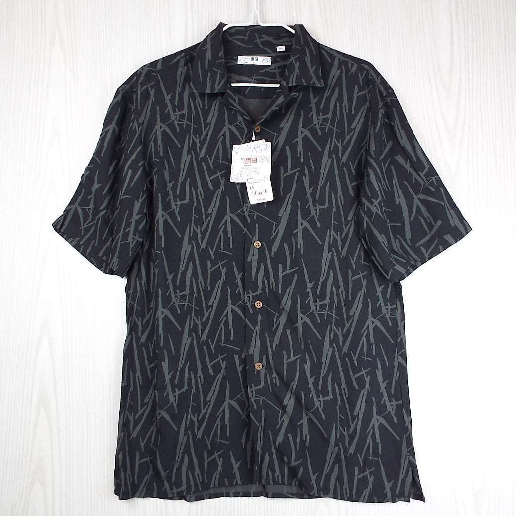 【レーヨン素材】未使用 UNIQLO(ユニクロ) ハワイコレクション 総柄 半袖 アロハシャツ XSサイズ(肩幅49cm)ブラック グレー【湘南倉庫】メンズ古着 682222784176